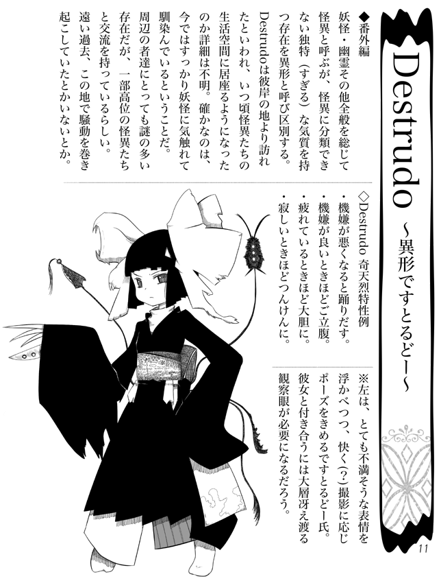 ◆番外編 妖怪・幽霊その他全般を総じて怪異と呼ぶが、 怪異に分類できない独特(すぎる)な気質を持つ存在を 異形と呼び 区別する。 Destrudoは彼岸の地より訪れたといわれ、 いつ頃怪異たちの生活空間に 居座るようになったのか詳細は不明。 確かなのは、今ではすっかり妖怪に気触れて 馴染んでいるということだ。 周辺の者達にとっても謎の多い存在だが、 一部高位の怪異たちと交流を持っているらしい。 遠い過去、この地で騒動を巻き起こしていたとか いないとか。 ◇Destrudo 奇天烈特性例 ・機嫌が悪くなると踊りだす。 ・機嫌が良いときほどご立腹。 ・疲れているときほど大胆に。 ・寂しいときほどつんけんに。 ※左は、とても不満そうな表情を浮かべつつ、 快く(?)撮影に応じポーズをきめる ですとるどー氏。 彼女と付き合うには大層冴え渡る観察眼が必要になるだろう。 |
